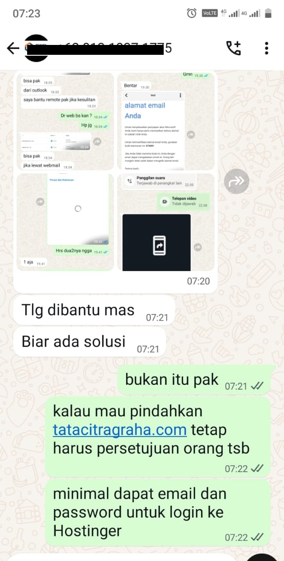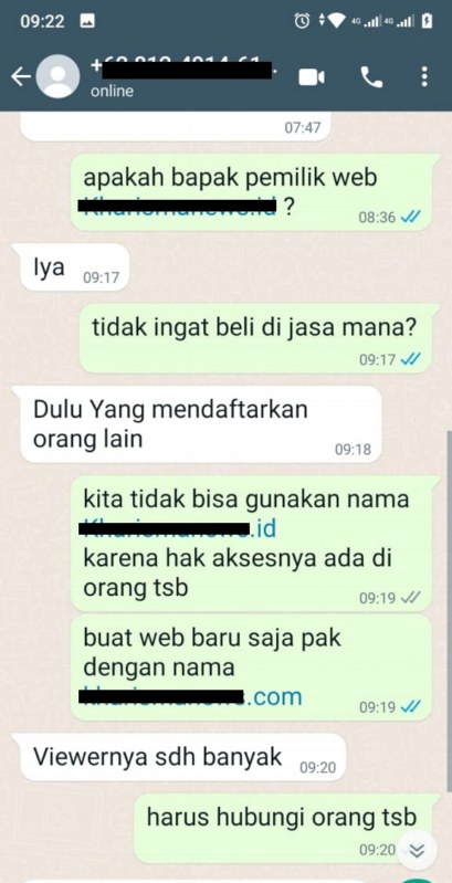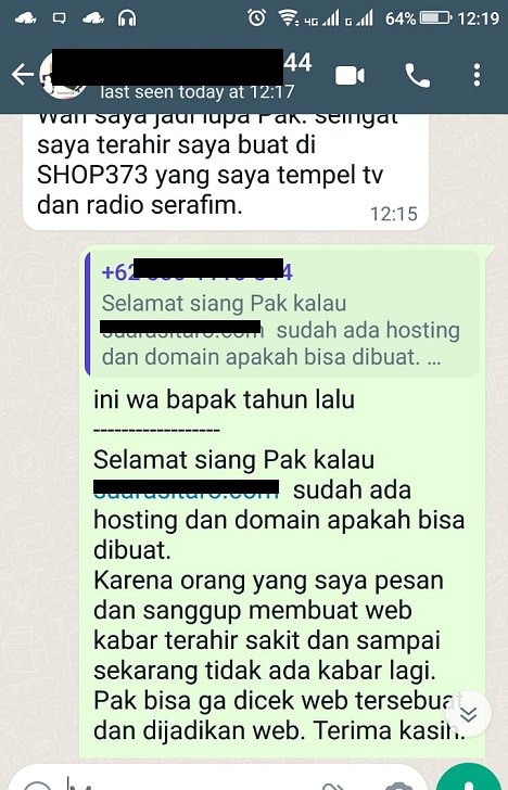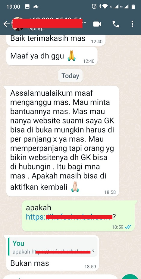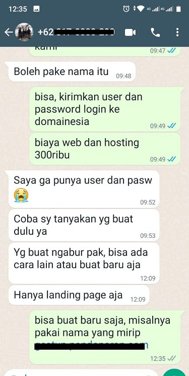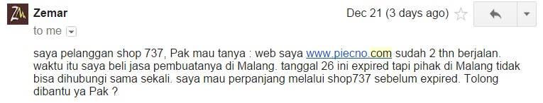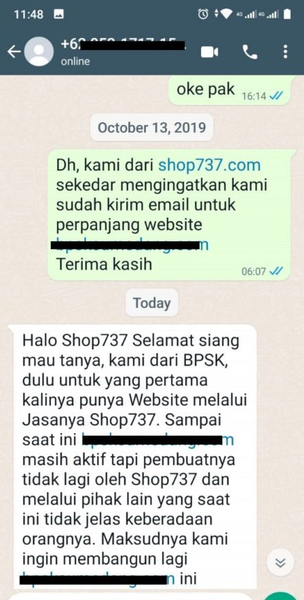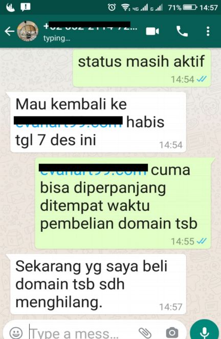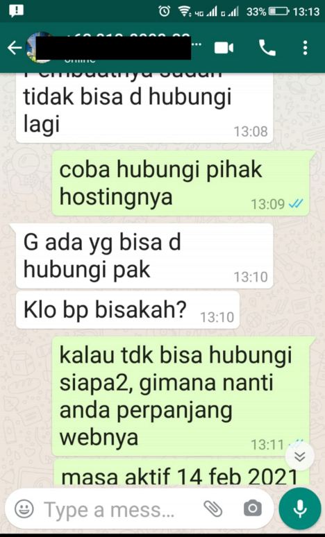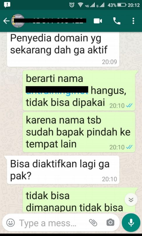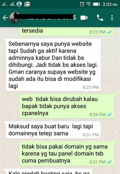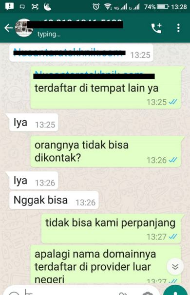 Dibawah ini adalah contoh beberapa kasus yang kesulitan perpanjang domain website karena jasa pembuatnya sudah tutup atau tidak bisa dihubungi. Lalu menghubungi kami untuk bantuan perpanjang. Tentu tidak bisa kami perpanjang: