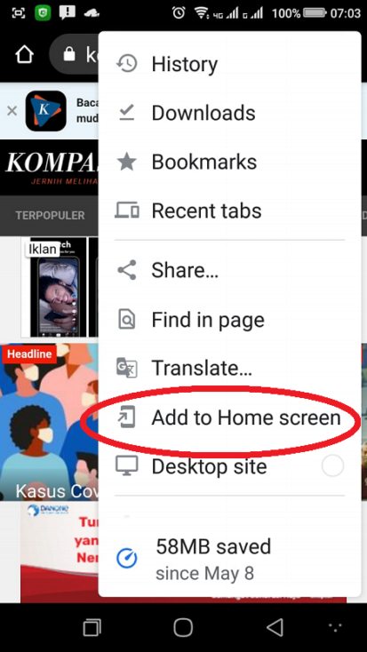 Caranya: Ketika membuka website, klik tanda titik-tiga di kanan atas. lalu klik “Add to home screen” seperti dibawah ini